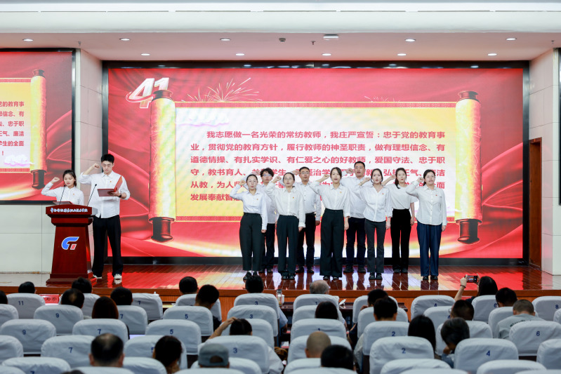 會上,高水平發(fā)展關(guān)鍵績效獲獎代表張珊老師、優(yōu)秀教師代表徐君老師依次上臺發(fā)言。張老師在會上分享了深耕“課堂-行業(yè)-競賽”三維聯(lián)動育人模式,并表示“高質(zhì)量發(fā)展不是一句口號,它在我們每一節(jié)用心的課堂上、每一次耐心的輔導(dǎo)中、每一個大膽的教改嘗試?yán)??!毙炖蠋熣f:“我們的學(xué)生就像待剪裁的面料,看似普通,卻藏著無限的可能,只需要有人幫他們找到合適的版型,耐心引導(dǎo)他們,就能縫制出屬于他們的精彩。”教師代表的思考與探索,正是教育家精神在基層教育實踐中的生動體現(xiàn),也為全體教師樹立了“扎根一線、潛心育人”的榜樣。新入職教師在領(lǐng)誓人的帶領(lǐng)下莊嚴(yán)宣誓,鄭重承諾為學(xué)生的全面發(fā)展奉獻智慧與力量,為黨和人民的教育事業(yè)而努力奮斗,全校教師再一次接受入職宣誓教育。