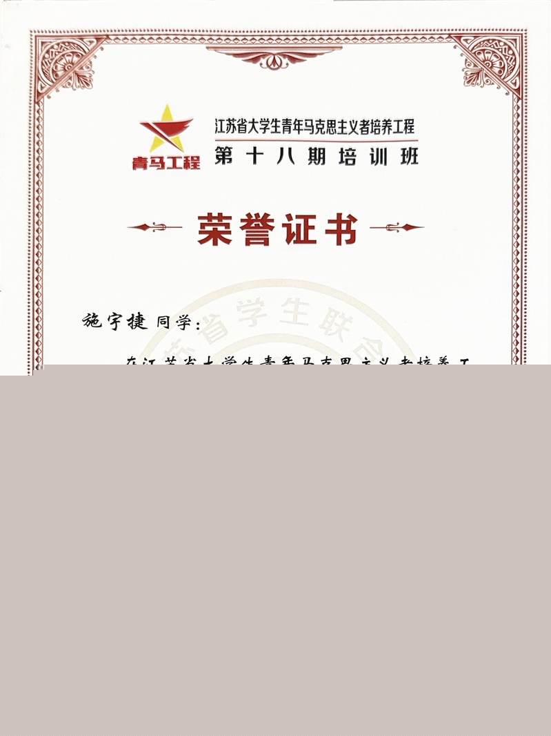 為深入學(xué)習(xí)貫徹黨的二十大精神和習(xí)近平總書(shū)記關(guān)于青年工作的重要思想,引導(dǎo)廣大青年增強(qiáng)政治素養(yǎng)和責(zé)任擔(dān)當(dāng),由團(tuán)江蘇省委、江蘇省學(xué)聯(lián)主辦的江蘇省大學(xué)生青年馬克思主義者培養(yǎng)工程第十八期培訓(xùn)班于2024年7月啟動(dòng)。經(jīng)過(guò)一年的學(xué)習(xí)培養(yǎng),我校智能制造學(xué)院施宇捷同學(xué)圓滿完成了理論學(xué)習(xí)、紅色教育、實(shí)踐鍛煉、作風(fēng)養(yǎng)成、交流研討等各項(xiàng)培訓(xùn)任務(wù),順利結(jié)業(yè),獲評(píng)“優(yōu)秀學(xué)員”榮譽(yù)稱(chēng)號(hào)!