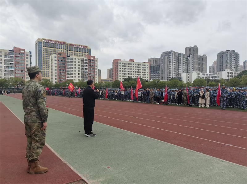 14:30,出征儀式在學校足球場舉行。中國人民解放軍95469部隊李旺參謀在動員講話中談到,徒步拉練是軍訓過程中的重要實踐環(huán)節(jié),既是對身體素質(zhì)的檢驗,更是對精神意志與組織紀律性的深度錘煉。他鼓勵同學們珍惜集體行動的機會,發(fā)揚團結(jié)拼搏、不畏困難的優(yōu)良作風,在拉練中互幫互助、共同進步。