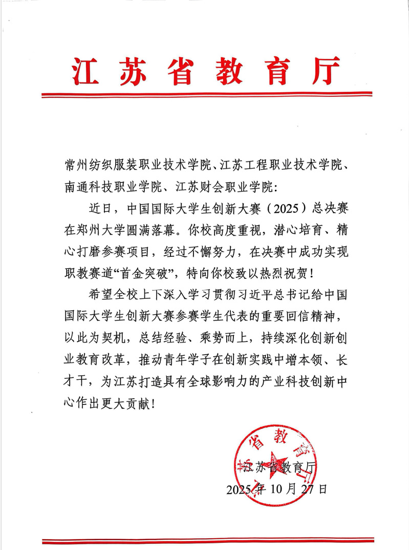 近日,中國(guó)國(guó)際大學(xué)生創(chuàng)新大賽(2025)總決賽在鄭州大學(xué)圓滿落幕。常州紡織服裝職業(yè)技術(shù)學(xué)院憑借對(duì)參賽工作的高度重視、對(duì)項(xiàng)目的潛心培育與精心打磨,在全國(guó)眾多高校的激烈角逐中脫穎而出,成功實(shí)現(xiàn)職教賽道“首金突破”,為江蘇省職業(yè)教育創(chuàng)新發(fā)展寫下亮眼一筆,獲江蘇省教育廳專門發(fā)函祝賀。