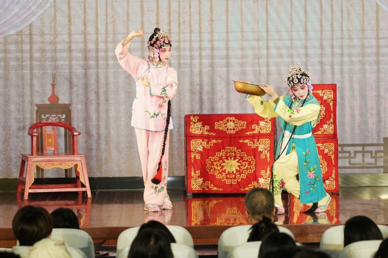 演出精選三折風(fēng)格各異的經(jīng)典劇目?,F(xiàn)實(shí)題材小戲《任性的李桂芳》由一級演員楊旻華與邵赟瑾、陳洪共同呈現(xiàn),該劇以一場年夜飯上的家庭矛盾為切入點(diǎn),深刻反映空巢老人的情感世界,展現(xiàn)戲曲對當(dāng)代社會現(xiàn)實(shí)的真切關(guān)懷?!惰笸鯇m·掛畫》一折則由楊銘瑜、龐安格擔(dān)綱,以靈動身段與詼諧念白,將待嫁少女的喜悅羞澀刻畫得惟妙惟肖,引來滿堂喝彩。傳統(tǒng)折子戲《雙推磨·推磨曲》由演員唐克、陳洪聯(lián)袂演繹,二人憑借醇厚唱腔與細(xì)膩表演,生動傳遞出勞動中萌生的真摯情感,彰顯傳統(tǒng)戲曲樸素雋永的藝術(shù)魅力。演出結(jié)束后,學(xué)生代表上臺互動,夏斌代表學(xué)校為蘇州市錫劇團(tuán)贈送了錦旗。