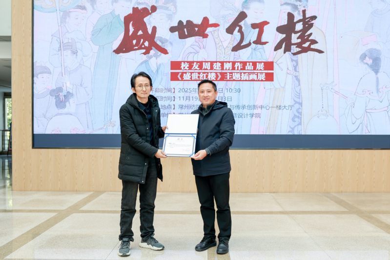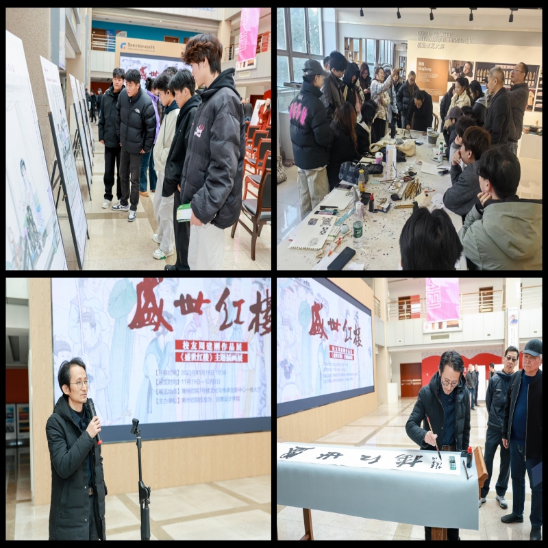 2025年11月19日上午,“盛世紅樓—周建剛校友主題插畫(huà)展”在我校文化傳承與創(chuàng)新中心一樓隆重開(kāi)幕。學(xué)校黨委委員、副校長(zhǎng)張文明,黨委委員、宣傳部部長(zhǎng)夏斌,創(chuàng)意設(shè)計(jì)學(xué)院院長(zhǎng)李方聯(lián),學(xué)生工作處副處長(zhǎng)顧加強(qiáng)等領(lǐng)導(dǎo)出席開(kāi)幕式。周建剛校友在裝潢941班學(xué)習(xí)期間的班主任宋躍良、專(zhuān)業(yè)老師喬京祿,同班同學(xué)朱世剛等10余名校友,以及創(chuàng)意設(shè)計(jì)學(xué)院師生代表80余人齊聚現(xiàn)場(chǎng),共同見(jiàn)證這場(chǎng)藝術(shù)與文學(xué)交融的視覺(jué)盛宴。開(kāi)幕式由創(chuàng)意設(shè)計(jì)學(xué)院黨總支書(shū)記祝燕芳主持。