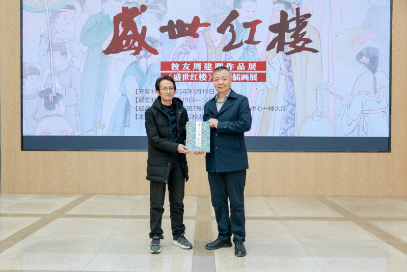 祝燕芳首先對(duì)周建剛校友的藝術(shù)成就做了詳細(xì)介紹。周建剛系我校裝潢941班優(yōu)秀畢業(yè)生,現(xiàn)為中國(guó)傳統(tǒng)文化促進(jìn)會(huì)會(huì)員、中國(guó)書(shū)畫(huà)家聯(lián)誼會(huì)創(chuàng)作委員會(huì)委員,其作品以工筆畫(huà)與年畫(huà)技法融合見(jiàn)長(zhǎng),兼具傳統(tǒng)底蘊(yùn)與現(xiàn)代審美,多幅作品被博物館、美術(shù)館及榮寶齋收藏。張文明副校長(zhǎng)在致辭中代表學(xué)校向周建剛校友表示熱烈祝賀與感謝。他指出,《紅樓夢(mèng)》作為古典文學(xué)瑰寶,與我校藝術(shù)類(lèi)專(zhuān)業(yè)定位高度契合,周建剛以插畫(huà)藝術(shù)重新詮釋經(jīng)典,展現(xiàn)了從傳統(tǒng)中汲取靈感、在敘事中構(gòu)建畫(huà)面的綜合能力,是我?!耙悦烙?、以文化人”理念的生動(dòng)實(shí)踐。他強(qiáng)調(diào),學(xué)校始終將美育貫穿人才培養(yǎng)全過(guò)程,此次展覽不僅為校園文化注入新活力,更激勵(lì)師生在審美體驗(yàn)中堅(jiān)定文化自信。隨后,周建剛校友向母校捐贈(zèng)其代表性作品,夏斌代表學(xué)校接收并致謝。李方聯(lián)為其頒發(fā)“美育導(dǎo)師”聘書(shū),期待未來(lái)在藝術(shù)教育與人才培養(yǎng)中深化合作。