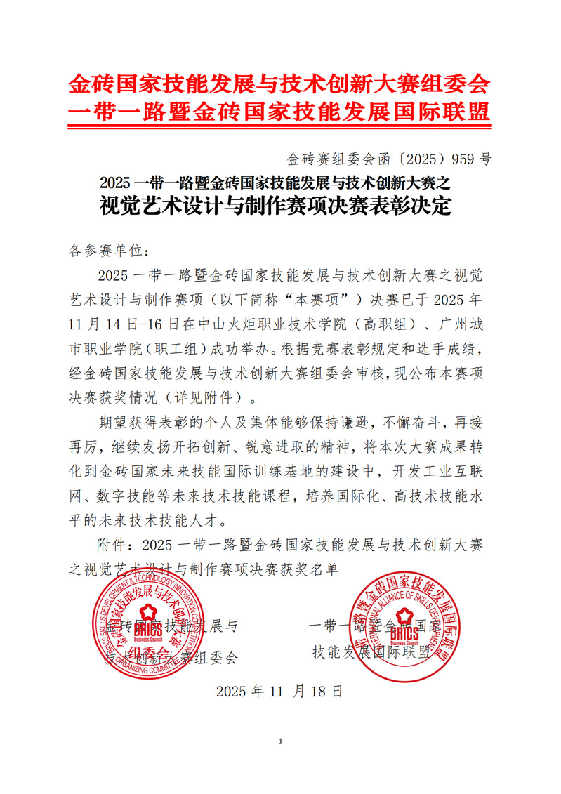 近日,在教育部中外人文交流中心聯(lián)合主辦的第九屆2025年“一帶一路”暨金磚國家技能發(fā)展與技術(shù)創(chuàng)新大賽(視覺藝術(shù)設(shè)計與制作賽項)全國總決賽職工組的賽場上,人文與健康學(xué)院副院長馬紅波,經(jīng)過激烈角逐,脫穎而出,取得職工組一等獎(金牌)的優(yōu)異成績,學(xué)校榮獲“最佳組織獎”榮譽稱號。