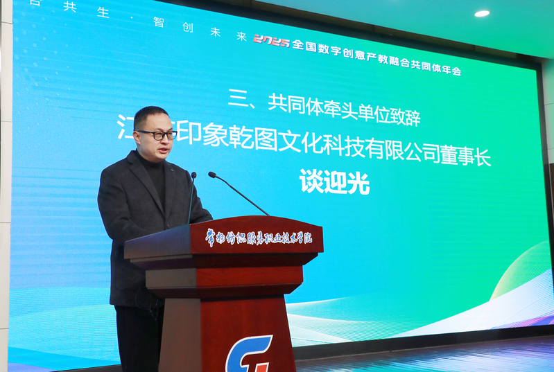 江蘇印象乾圖文化科技有限公司董事長談?dòng)馊婊仡櫫斯餐w一年來的工作成果。他指出:作為共同體的牽頭單位之一,我們深知責(zé)任重大。我們將立足于共同體發(fā)展的戰(zhàn)略高度,積極發(fā)揮橋梁紐帶和示范引領(lǐng)作用,重點(diǎn)從以下四個(gè)層面全力推動(dòng)共同體的建設(shè)和可持續(xù)發(fā)展:第一,搭建協(xié)同平臺(tái),構(gòu)筑產(chǎn)教融合新范式;第二,引領(lǐng)標(biāo)準(zhǔn)建設(shè),重塑人才培養(yǎng)新路徑;第三,賦能資源流通,激發(fā)創(chuàng)新共生新活力。第四,創(chuàng)新治理機(jī)制,共同探索數(shù)字創(chuàng)意產(chǎn)教融合新生態(tài),引領(lǐng)產(chǎn)業(yè)創(chuàng)新發(fā)展新趨勢。