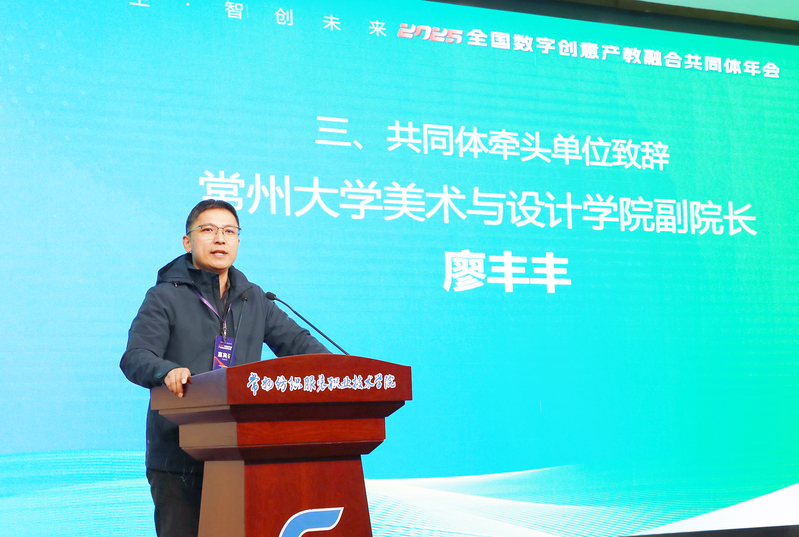 常州大學(xué)美術(shù)與設(shè)計(jì)學(xué)院副院長廖豐豐教授介紹了常州大學(xué)近年來在產(chǎn)教融合方面取得的成就,以及一年多來,數(shù)字創(chuàng)意產(chǎn)教融合共同體在數(shù)字創(chuàng)意人才培養(yǎng)、資源共享、師資培育、項(xiàng)目合作領(lǐng)域取得的成績。他強(qiáng)調(diào),面對(duì)機(jī)遇與挑戰(zhàn),要以更加務(wù)實(shí)的行動(dòng)深化產(chǎn)教融合:一是聚焦“需求導(dǎo)向”讓人才培養(yǎng)與產(chǎn)業(yè)升級(jí)同頻共振;二是強(qiáng)化“創(chuàng)新驅(qū)動(dòng)”,讓數(shù)字技術(shù)攻關(guān)與成果轉(zhuǎn)化雙向賦能;三是深化“生態(tài)共建”,讓院校資源與企業(yè)需求深度耦合,真正實(shí)現(xiàn)“教育服務(wù)產(chǎn)業(yè)、產(chǎn)業(yè)反哺教育”的良性循環(huán)。
