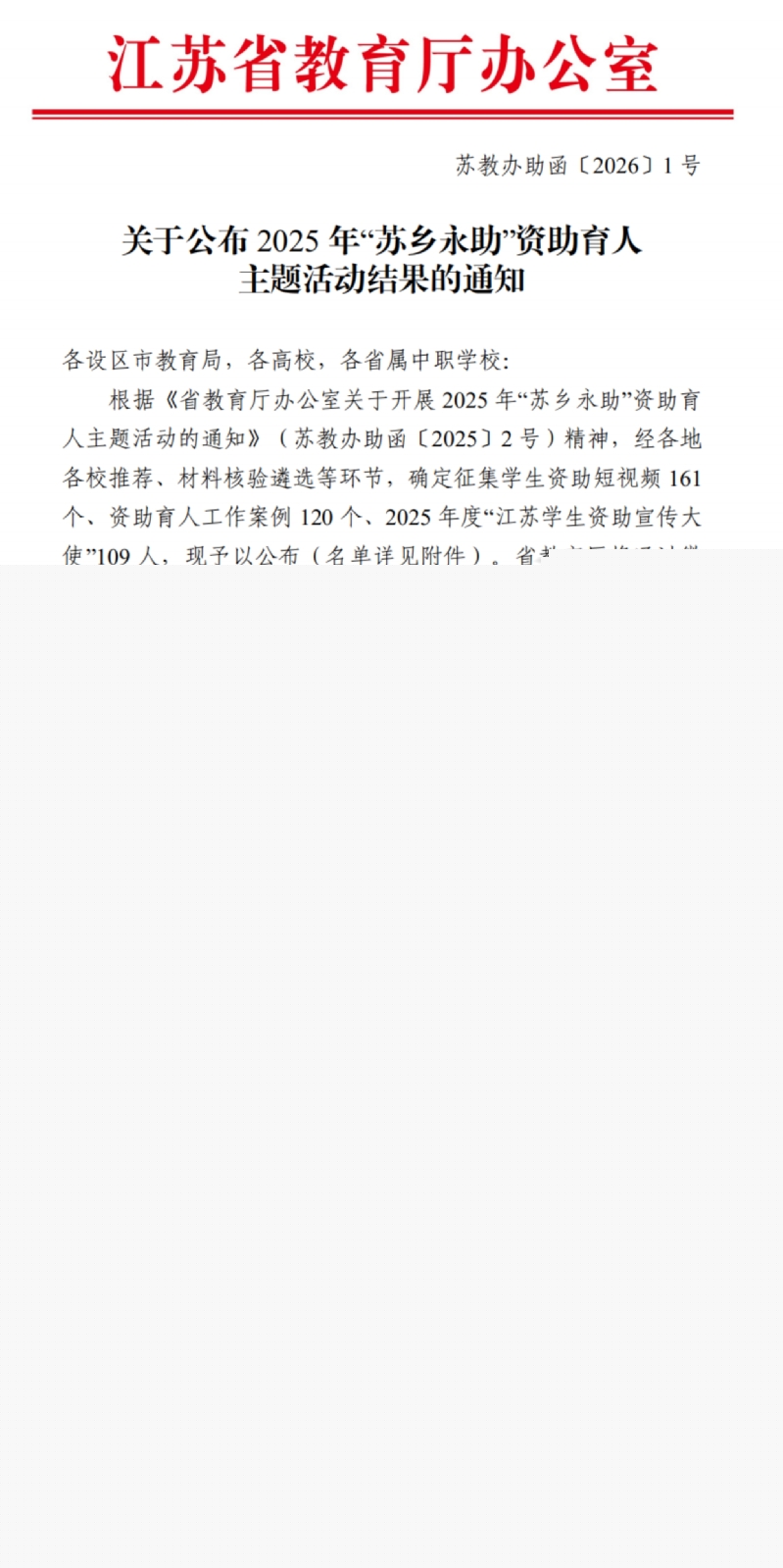 近日,江蘇省教育廳正式公布2025年“蘇鄉(xiāng)永助”資助育人主題活動(dòng)評(píng)選結(jié)果,我校報(bào)送的《助學(xué)筑夢(mèng),向光而行》《經(jīng)緯筑夢(mèng),揚(yáng)帆起航》兩部學(xué)生資助短視頻獲評(píng)優(yōu)秀作品,數(shù)字商貿(mào)學(xué)院劉鑫雨同學(xué)獲評(píng)2025年度“江蘇學(xué)生資助宣傳大使”稱號(hào),獲獎(jiǎng)數(shù)量再創(chuàng)新高。