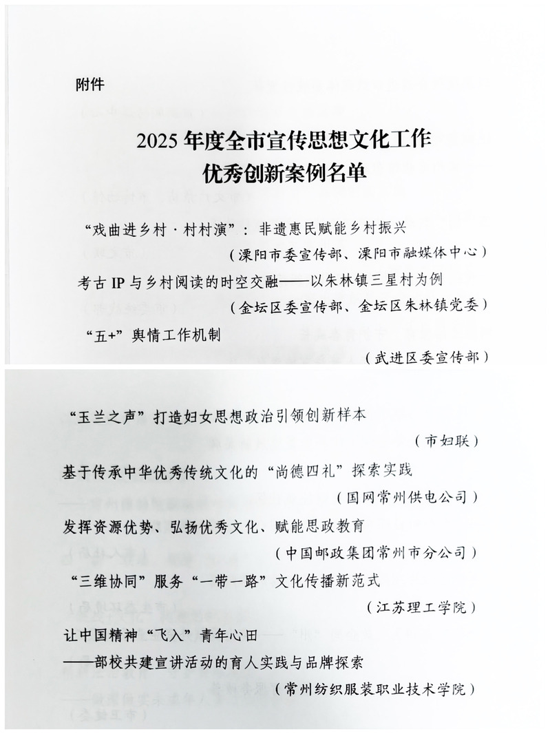近日,中共常州市委宣傳部發(fā)布《關(guān)于2025年度全市宣傳思想文化工作優(yōu)秀創(chuàng)新案例的通報》。我?!白屩袊瘛w入’青年心田——部校共建宣講活動的育人實踐與品牌探索”項目成功入選。