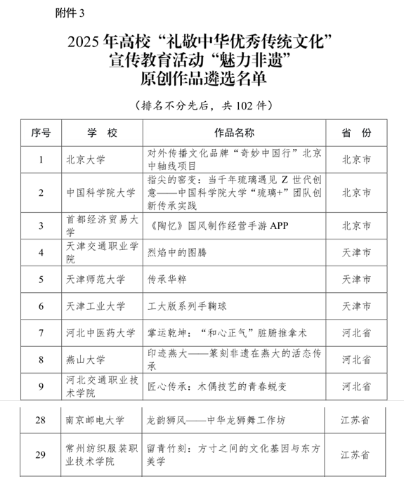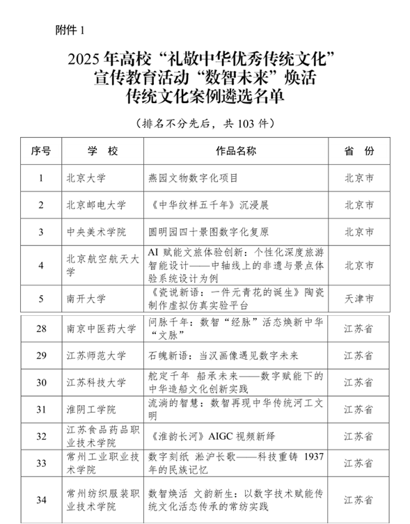 近日,教育部辦公廳公布了2025年高?!岸Y敬中華優(yōu)秀傳統(tǒng)文化”宣傳教育活動(dòng)結(jié)果。我校選送的《數(shù)智煥活?文韻新生:以數(shù)字技術(shù)賦能傳統(tǒng)文化活態(tài)傳承的常紡實(shí)踐》成功入選“數(shù)智未來(lái)”煥活傳統(tǒng)文化案例遴選名單;《留青竹刻:方寸之間的文化基因與東方美學(xué)》成功入選“魅力非遺”原創(chuàng)作品遴選名單。