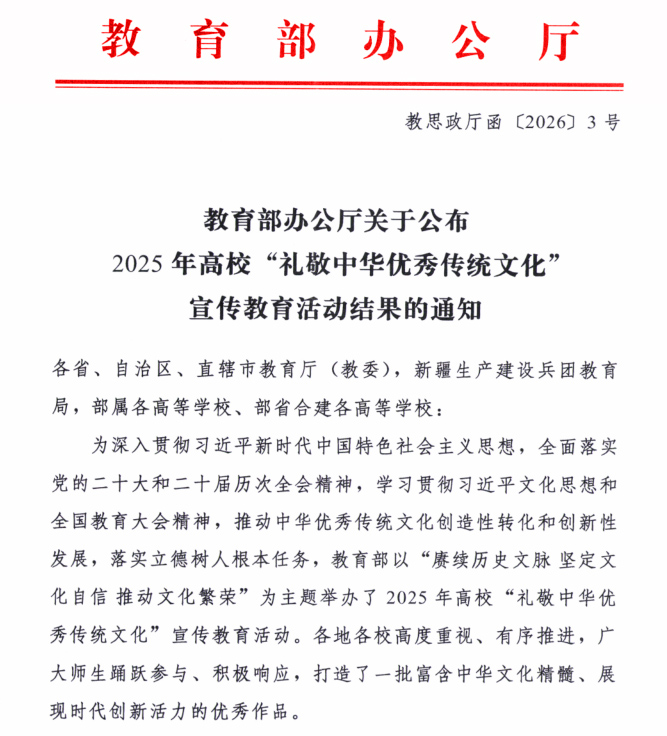“禮敬中華優(yōu)秀傳統(tǒng)文化”宣傳教育活動(dòng)由教育部思想政治工作司牽頭主辦,是教育部立足中華優(yōu)秀傳統(tǒng)文化傳承發(fā)展,持續(xù)加強(qiáng)高校傳統(tǒng)文化教育、深化校園文化建設(shè)的重要長(zhǎng)效舉措,旨在推動(dòng)中華文脈在校園落地生根、薪火相傳。2025年活動(dòng)共遴選全國(guó)高校優(yōu)秀作品305項(xiàng),江蘇省高職院校共有13個(gè)項(xiàng)目入選,我校2項(xiàng)作品入選位列江蘇省高職院校第二位,實(shí)現(xiàn)重大突破,充分展現(xiàn)了學(xué)校在文化育人領(lǐng)域的扎實(shí)積累和創(chuàng)新探索。