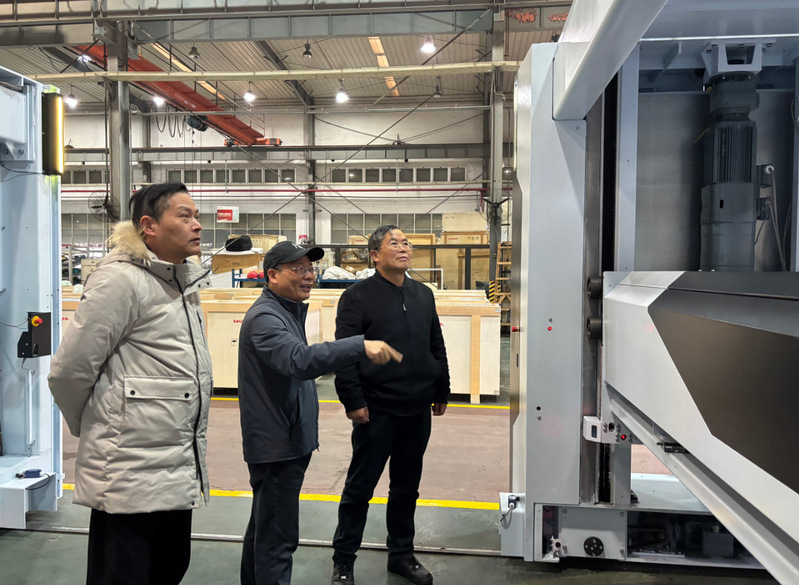 張文明一行先后深入企業(yè)機(jī)加工車間、智能倉庫、裝配車間及研發(fā)部,實(shí)地調(diào)研了紡紗工藝流程、紡紗裝備生產(chǎn)過程、產(chǎn)品研發(fā)進(jìn)度等情況,詳細(xì)詢問了企業(yè)生產(chǎn)運(yùn)營、技術(shù)創(chuàng)新及人才儲備等相關(guān)事宜,對企業(yè)技術(shù)實(shí)力與產(chǎn)品的智能化水平給予了高度評價。